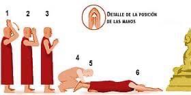 * Unir las manos sobre la coronilla: Representa la aspiración que tenemos de llegar a ser budas, simbolizando la upsnisha, la protuberancia que tienen en la cabeza.